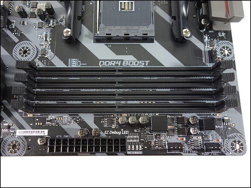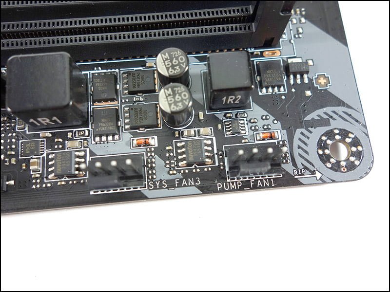 This motherboard has four fan headers near the CPU socket, one is the usual CPU fan header, there are two system fan headers, and one header labeled PUMP_FAN1 that has been designed for water pumps and can supply up to 2 amps of current. All six of the onboard fan headers are fully controllable via both DC and PWM fan control modes, and the motherboard itself can even detect and configure the fans.