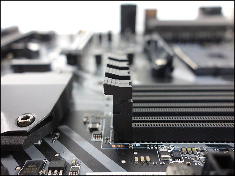 The four DDR4 memory slots are fed by a single-phase VRM, though it is a beefy phase since the MOSFETS have been doubled. By the way, they are the very same NIKOS MOSFETs as in the CPU VRM. This motherboards supports up to 64GB of total system memory, and it has been certified for overclocked memory speeds of up to DDR4-3200. Make sure to check out our Overclocking Results section to see whether we were able to hit that level.