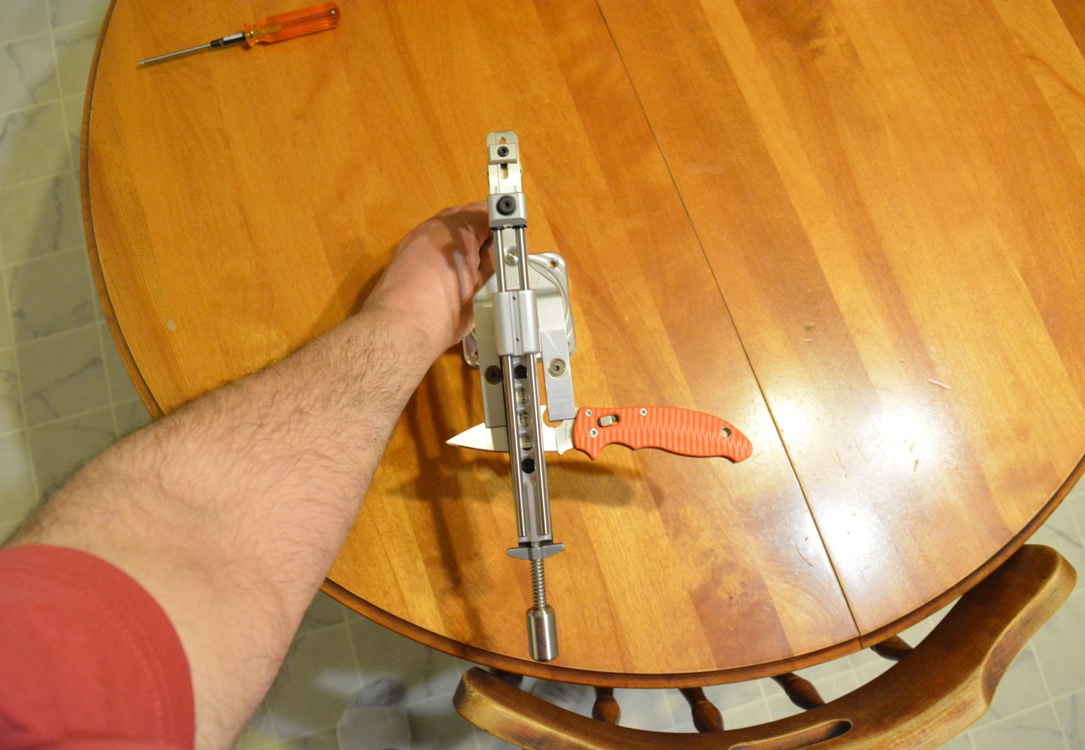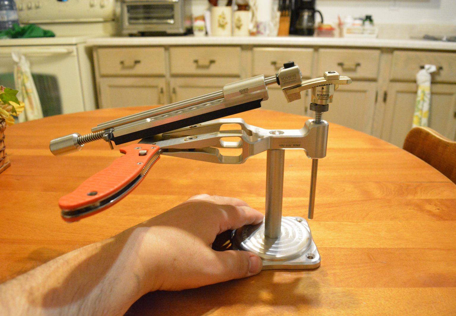That's my Vantedge sharpener with my Spyderco Manix 2 clamped in and waiting to get sharpened.