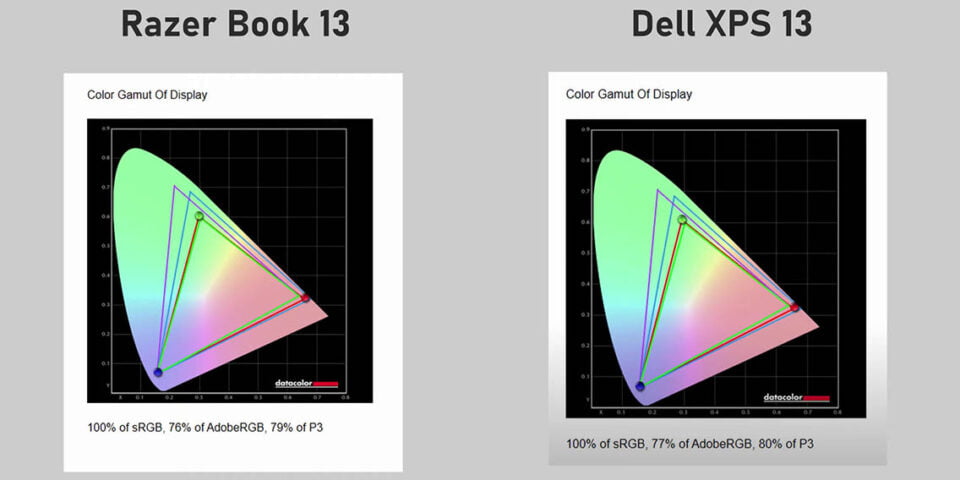 Moving on to the display, Razer opted to go with a 16:10 aspect ratio on the Book 13. What that means is you get a resolution of 1920×1200, which is exactly the same found on the XPS 13 from Dell. I really appreciate this approach since you get more vertical screen real estate to work with, and I think it suits laptops that are geared towards productivity. It is a really good quality display too as it covers 100% sRGB, 76% Adobe RGB, and 79% DCI-P3. It is good enough to edit photos and watch videos, but compared to the XPS 13 the Book 13 still needs to catch up because this panel only gets as bright as 277 nits compared to the 500 nits craziness on the XPS 13. If you value screen brightness, especially on a thin line, then maybe consider another option because this display just doesn’t get super bright. Perhaps the 4K model has a brighter screen, but that is something that I will have to test when I get my hands on that top trim. Overall, it’s a good screen, I love the aspect ratio, but I feel like the XPS display is remarkable.