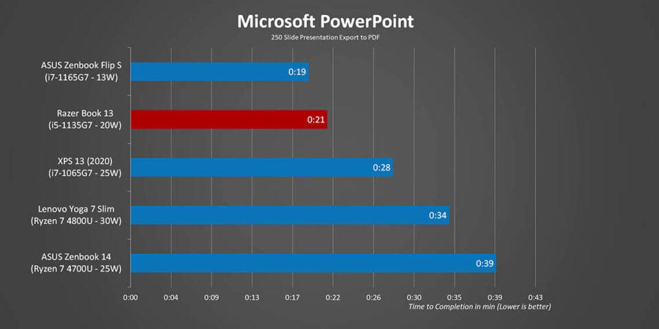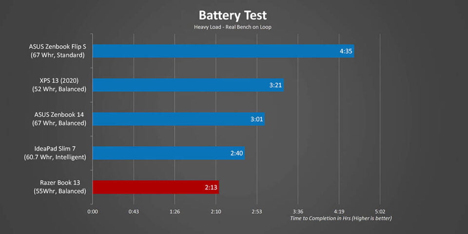 Battery life does need a bit more of an explanation because Razer equipped the Book 13 with a capacity of only 55Wh. While that is still more than the XPS 13 we also can’t forget Dell’s competitor limits it CPU to lower power limits, whereas Razer is focused on pure performance. That leads to really respectable results for the Core i5-1135G7 in a lighter workload like this one, and that is good news for anyone who needs all-day battery life for basic tasks. However, even in Balanced mode, the Book 13 really doesn’t have the greatest results for a thin-and-light, and that is mostly due to higher power limits when there is a heavier load. While this model might only be rocking a Core i5, it still drinks down battery juice very fast. You see this laptop is really meant for light duty, and if you want to do something intensive you are much better off just plugging this thing in.