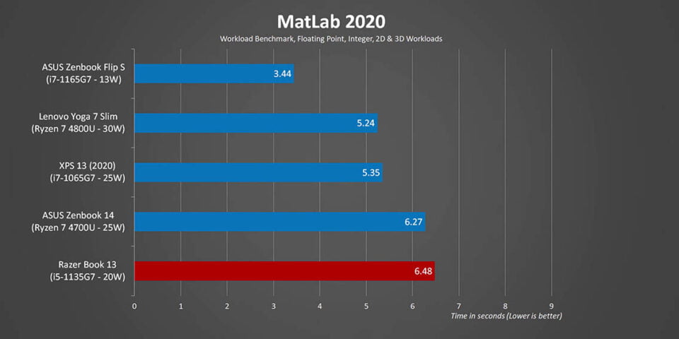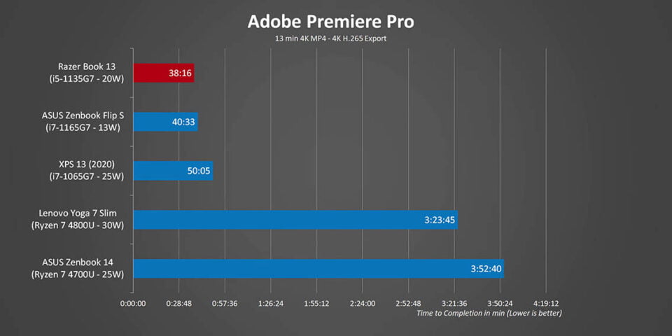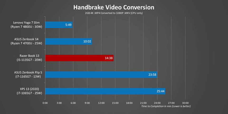 Now let’s move on to actual performance, and for that I do have to mention that I did set this to the high performance mode, which is what we do with all the other laptops that are in the charts. Starting off with real-world tests, and this needs a lot more of an explanation. In any multi-threaded programs like Cinebench the additional power given to the Core i5-1135G7 means it can convincingly beat an Core i7-1165 G7 that has been set to 13W like the one on the Zenbook. That is because it can sustain much higher frequencies over longer periods of time. Moving on to single core results, and you will see the exact opposite here because power limits don’t factor into the equation and the Core i7 surges out in front. Moving on, and the situation repeats itself over and over again with the Core i5 coming out ahead in any app that stresses the CPU, while the Tiger Lake Core i7 equipped on the Zenbook dominates in lightly-threaded programs. This also meshes really well into Razer’s targeted audience for the Book 13. It is meant to deliver great performance in rendering, transcoding, or other higher level productivity tasks for creators and other professionals in a thin and portable form factor… and that is exactly what it does!