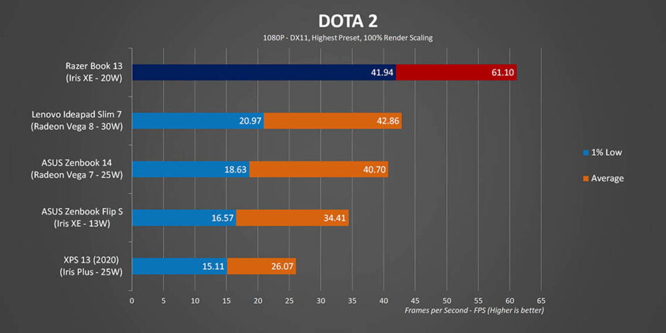 Gaming isn’t something that is normally expected from these standard lights with integrated graphics, but now that Intel’s Xe graphics core is on the scene that is changing in a big way. Overall, the Book 13’s higher power limit allows the integrated GPU to deliver some impressive results… for an ultrabook. There are still some odd things going on though, like a massive score in DOTA, but that could be because Razer is running a newer verified driver than ASUS has approved for their laptop. But then again, this thing still refused to run Rainbow 6: Siege so there is obviously still some growing pains here.